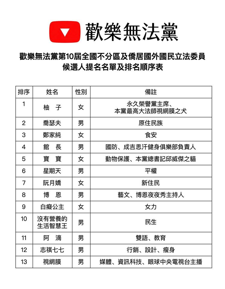 呱吉、志祺七七、視網膜於這個月5日宣布組成「歡樂無法黨」,並於隔天召開記者會,正式將文件送進內政部審核,表達認真組黨的決心。更於14日召開政黨成立大會,吸引超過一萬人在線觀看直播,聲勢浩大。而歡樂無法黨也公布「不分區立委」名單,瞬間成為網路熱門話題。