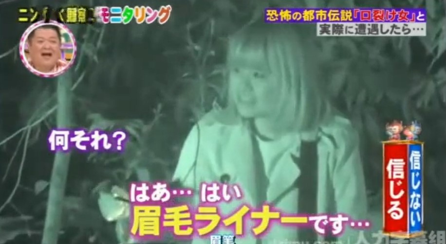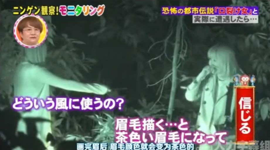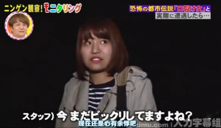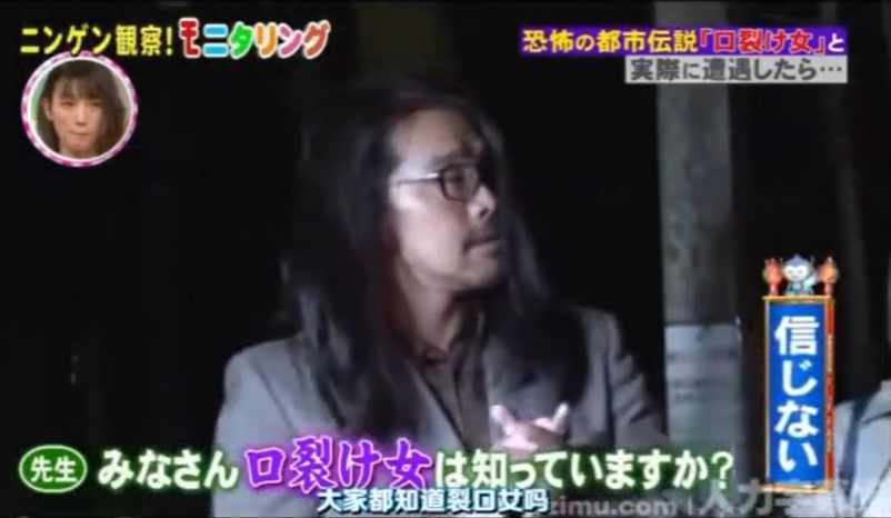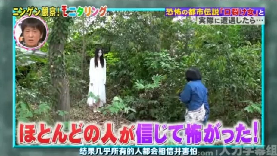 日本人在綜藝節目企劃上,往往都可以想出特別奇葩的主題,著名的日本深夜綜藝節目《人類觀察學》就是以製造許多奇葩的情境,透過隱藏攝像頭捕捉被觀察者的反應,獲得許多日本觀眾的歡迎。這次節目組結合了都市傳說之一裂嘴女,在節目中以都市傳說如果真實存在,看人會有甚麼反應。