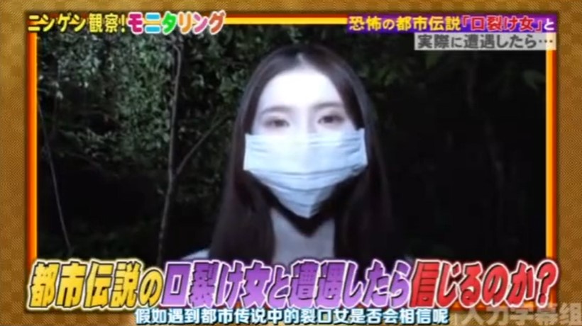 日本都會傳說之一的裂嘴女或稱裂口女,以披頭散髮、用口罩矇著裂口的女人形象出現,傳說中會裂嘴女會戴著口罩單獨一個人她會叫住你,問道「我漂亮嗎?」。日本深夜節目《人類觀察學》將營造出裂嘴女出現場景,節目一開始廣發邀請素人進行都市挑戰計畫,製作單位告訴不知情的素人,這附近會有裂嘴女出沒的傳聞,並告訴她如果真的遇到裂嘴女,只要將自己最重要的物品交出,就不會受到傷害。