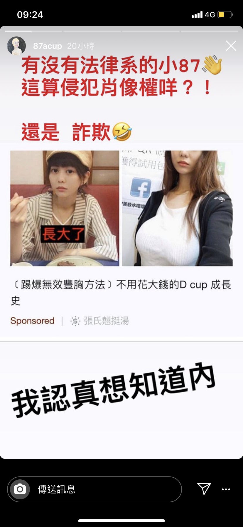 白癡公主日前在instagram貼出一則限時動態,語氣無奈的問粉絲「有沒有法律系的小87,這算侵犯肖像權咩?!」同時附上一則廣告截圖,赫然是兩張她的照片,只見照片裡左邊的她無辜大眼望著鏡頭,身穿條紋襯衫,胸前被打上大大的「長大了」字眼,而右邊則是她穿著黑色外套與白色上衣的照片,雄偉胸部很是惹眼。