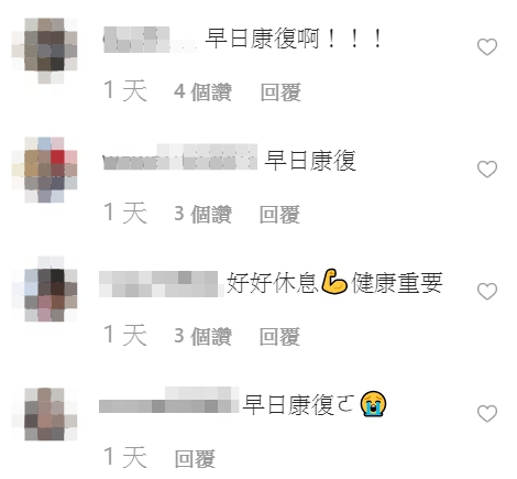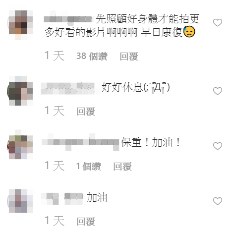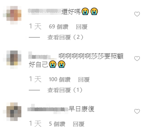 愛莉莎莎貼文po出,粉絲也相當心疼,紛紛暖心安慰「啊啊啊啊啊莎莎要照顧好自己」「早日康復啊!!!」「好好休息,健康重要」「好好休息,期待你回歸」「先照顧好身體才能拍更多好看的影片啊啊啊,早日康復」「保重!加油!」,另一位人氣網紅「劉力穎」也留言「姊,加油喔。」