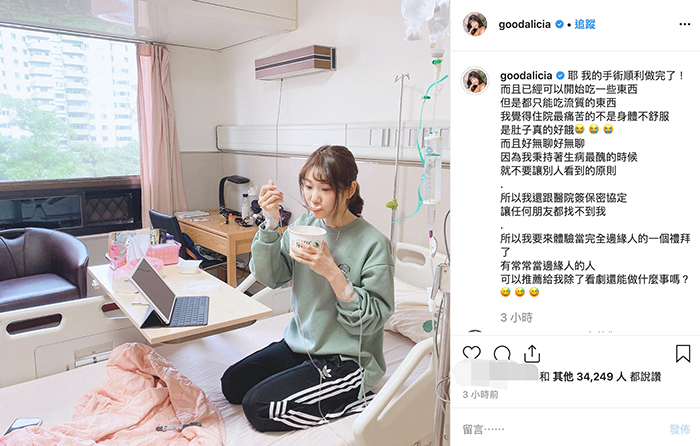 愛莉莎莎也再度於23日更新近況,曬出病床照表示自己手術順利完成,同時她也透露自己術後只能吃流質食物,更無奈說道「我覺得住院最痛苦的不是身體不舒服,是肚子真的好餓」。愛莉莎莎也在貼文中指出,住院十分地無聊,但由於秉持著「生病最醜,不要讓別人看到」的原則,因此和醫院簽訂保密協定,讓任何人都找不到她!
