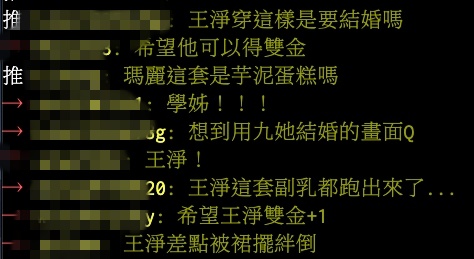 當《返校》女主角王淨走上紅毯時,瞬間成為網友們的焦點,大家都激動得在網路上熱烈討論她這一次所穿的衣服,紛紛留言表示,「王淨真的很美!」、「王淨好讚!」、「她這一次高衩開得好讚~」、「王淨是要結婚嗎?」、「希望王淨雙金~」、「王淨這套副乳跑出來了啦!」、「學姊!!」、「學姊瘦了~」。
