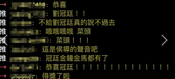 劉冠廷在發言前便忍不住哽咽,謝謝導演願意把角色交給他,謝謝母校,更感謝老師沒有放棄他,才能展露頭角。他還表示,不敢表示自己來自劇場,謙稱自己「還太弱了」,也感謝家人,表示自己能生在這樣的家庭,他非常幸運。除此之外,他也透露自己的媽媽,就像普羅大眾的媽媽一樣,總是默默地支持他,讓台下的媽媽也忍不住紅了眼眶。
