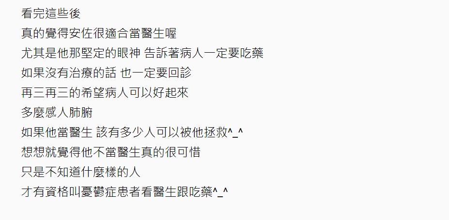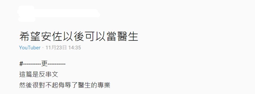 日前孫安佐發布關於「墮胎風波」的聲明影片,隨後在台灣知名論壇「Dcard」中,便有網友以「希望安佐以後可以當醫生」為題發文,原PO在文中提到,孫安佐在影片裡用堅定的眼神,說著感人肺腑的叮嚀,並且一直重複說著記得要吃藥等話,因此原PO覺得孫安佐很適合當醫生,「想想就覺得他不當醫生真的很可惜」!隨後原PO也更新坦言這是一篇「反串文」,引發網友熱烈討論。