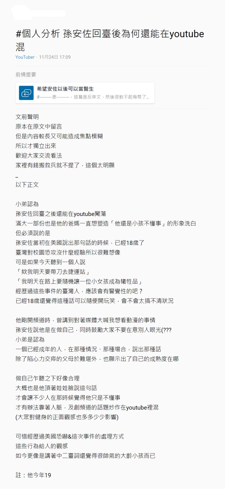 文章一出後,另外也有網友延伸發表看法,以「#個人分析 孫安佐回臺為何還能在youtube混」為題發文,原PO分析表示,孫安佐之所以回台能當youtuber闖蕩,是因為父母極力以「小孩不懂事」替他洗白,而原PO也提到,「孫安佐當初在美國說出這句話的時候,已經18歲了,18歲還覺得這種話可以隨便開玩笑,會不會太搞不清楚狀況?」同時原PO也認為,對於哪種話不能開玩笑,成年人應該已經清楚能分辨!