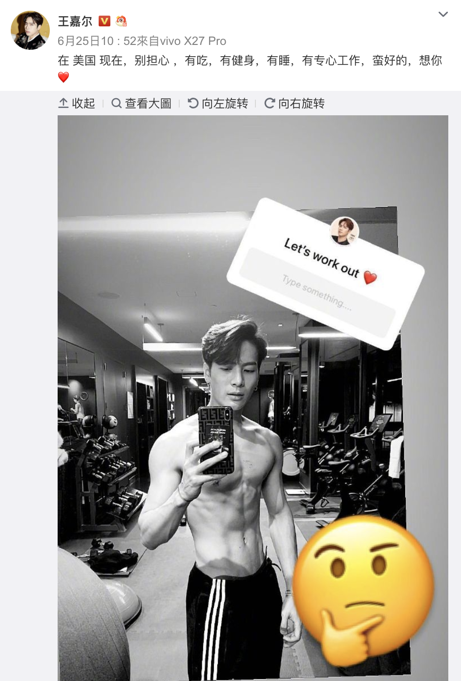 在今年6月25號時,王嘉爾在微博上曬出一張健身的自拍照,並配上文字:「在 美國 現在,別擔心 ,有吃,有健身,有睡,有專心工作,蠻好的,想你」,文末附上了一個愛心的符號,然而粉絲們發現王嘉爾發文寫的是「想你」而不是「想你們」,紛紛猜測王嘉爾是不是戀愛了,崩潰留言說道:「看過一個文章說 當你的偶像開始頻繁使用『你』而不是『你們』 那就恭喜你了 你的偶像可能開始戀愛了」,這次王嘉爾曬照時雖然王嘉爾已經聲明是刮鬍子不小心刮上,但脖子上的亮點也被網友聯想是不是和草莓有關,再次引發討論。