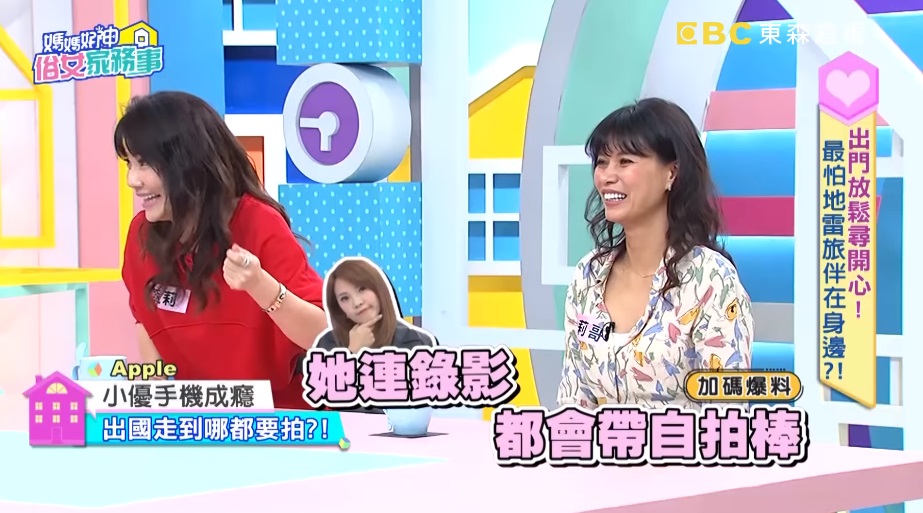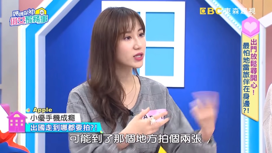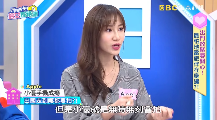 最近Apple在節目《媽媽好神之俗女家務事》中大肆爆料,說小優根本就是3C成癮,通常她跟瑤瑤一起出門,都是隨手拍個兩張照片就收手了,還是以享受旅程為主,但小優不是,小優整個人是無時無刻瘋狂在拍照、錄影,而且錄完影片之後還會忙著用手機剪片!