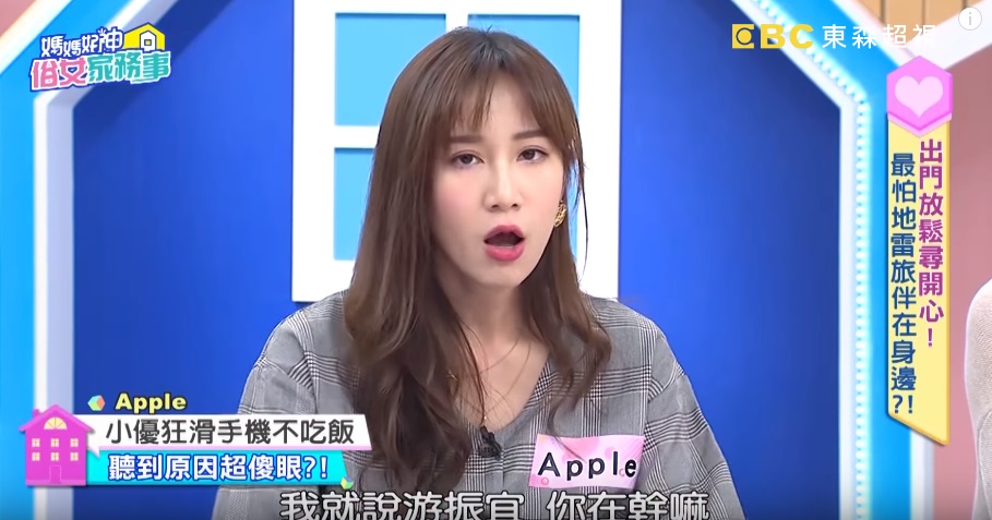 藝人Apple(黃暐婷)跟瑤瑤(黃喬歆)還有好姊妹小優(游振宜),前陣子三個人一起飛日本旅行,結果在旅途中小優做了許多舉動惹毛了Apple,讓她整個受不了到在節目上瘋狂爆料,說小優「一直問何時要PO照片到社群平台,吃飯還瘋狂滑手機!」連主持人佩甄聽了都傻眼說,「她是有病哦?比這幹嘛?」