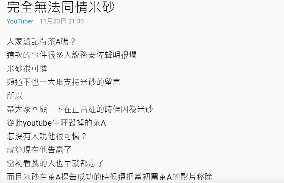 日前有網友在Dcard上發文,以「完全無法同情米砂」為題,提到過往曾和米砂爆出感情糾紛的另一位知名coser「茶A」,原PO認為茶A的youtuber生涯全被毀掉,在文中表示「茶A正當紅的時候,因為米砂從此youtube生涯毀掉,怎沒有人說他很可憐?就算現在他告贏了,當初看戲的人也早就都忘了。」原PO也表達自己的看法,「我覺得真正受傷的人,並不會想把傷口拿出來給大家檢視。」