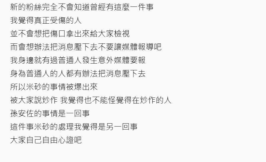 大尺度網紅「米砂」原本是一名 Coser,後來轉戰 YouTube 經營個人頻道「Misa 米砂」,靠著「老濕姬」辛辣尺度談話而殺出一條血路,知名度大開。先前她爆出曾與孫安佐發生性關係,甚至懷孕而拿掉小孩,最後遭孫安佐反擊暗指「精神有問題」,米砂近日也因此飽受外界強烈抨擊。事件不斷延燒,日前則有網友在Dcard上發文,認為「完全無法同情米砂」。