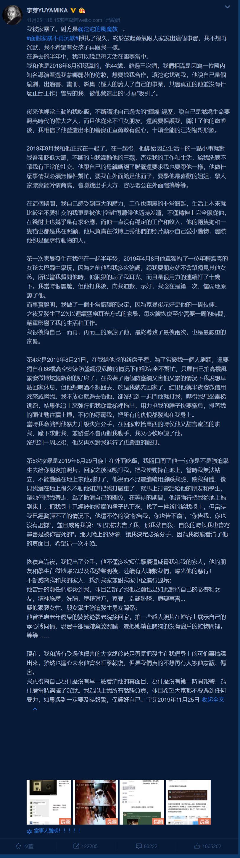 中國時尚博主「宇芽」以超擬真的妝容在網路上獲得高人氣,在昨日宇芽在個人微博中以「我被家暴了」作為開頭,此文一出震驚了眾多網友。文中指控著現任的男友,在交往期間不斷地對她使用暴力,並且會限制他人生自由、社交等,同時附上了許多對話截圖,甚至還有在電梯中被拖出去的影像,一曝光立刻引起網友熱烈關注。