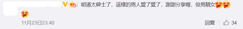 對於明道紳士的行為,在網路大受好評,大讚貼心而且不失分寸,演出過許多偶像劇的明道,戲裡戲外都充滿著白馬王子的氛圍,網友紛紛直呼,「天吶少女時代的偶像劇男主」、「明道就是把生活細節過成了王子」,更有網友直接將兩人配對「明道太紳士了,這樣的男人愛了愛了,謝謝分享喔,俊男靚女」、「熱巴可以考慮明道阿」。