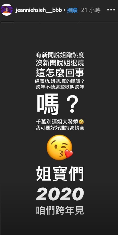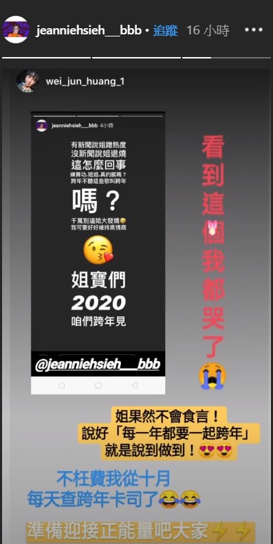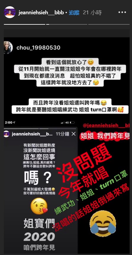 隨後,謝金燕也在限時動態發了截圖,內容都是粉絲留言給她說,「從11月就一直關注姊姊今年會在哪跨年,超怕姐姐真的不唱了,跨年沒看姐姐還叫跨年嗎?」,謝金燕也回應粉絲說,「沒問題,今年就唱練武功、姐姐、turn口罩!沒唱的話姐姐倒過來寫」。緊接著又在下一則限時動態貼出其它粉絲的動態,隔空跟大家呼喊「準備迎接正能量吧大家~」。