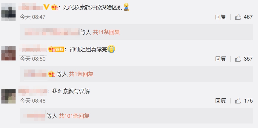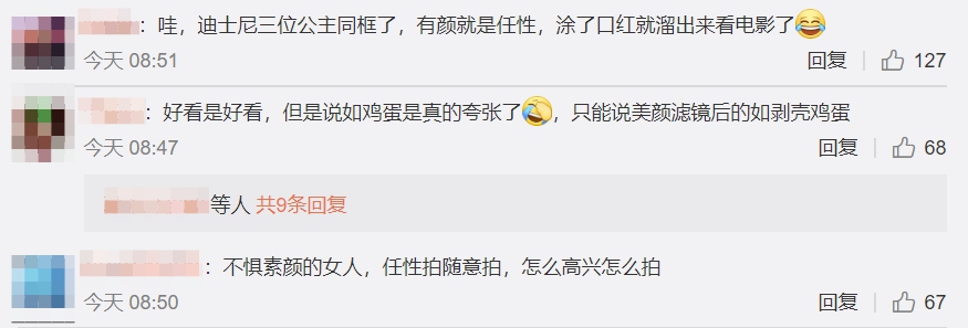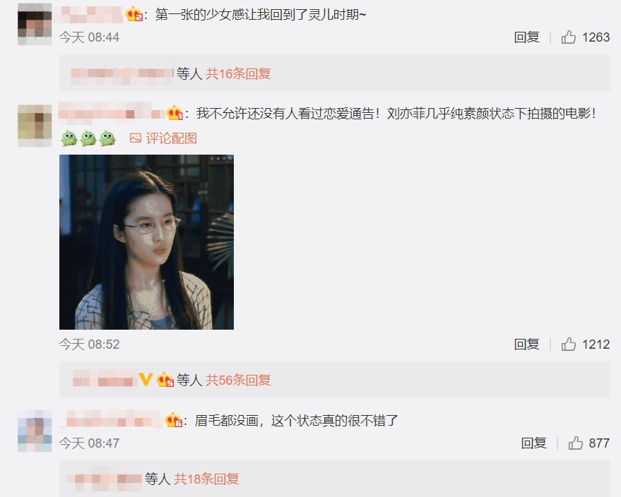 劉亦菲的素顏引起網友熱烈討論,紛紛留言「不懼素顏的女人,任性拍隨意拍,怎麼高興怎麼拍」、「她化妝素顏好像沒啥區別」、「眉毛都沒畫,這個狀態真的很不錯了」、「第一張的少女感讓我回到了靈兒時期」、「神仙姐姐真漂亮」,也有網友眼尖看出劉亦菲塗了唇膏,「哇,迪士尼三位公主同框了,有顏就是任性,塗了口紅就溜出來看電影了」、「我對素顏有誤解」。