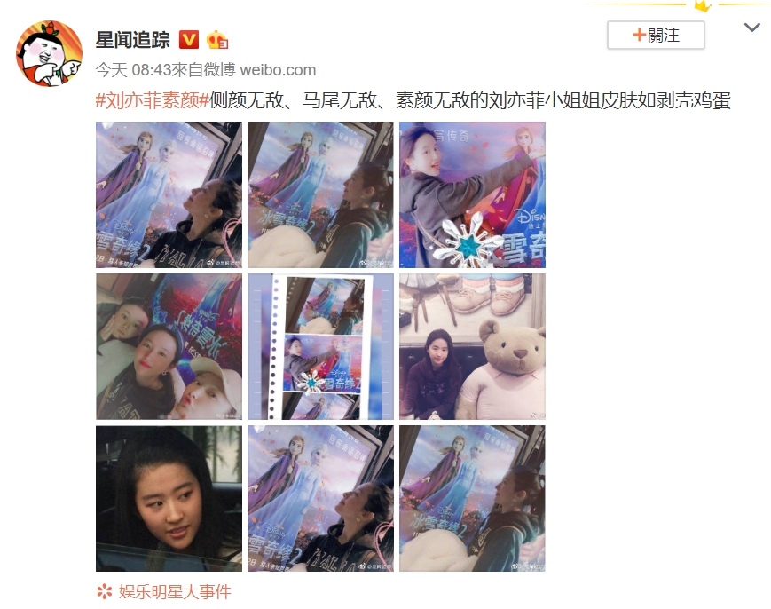 今年32歲的劉亦菲在2002年演出「金粉世家」出道,至今已經17年,私下的她經常不愛上妝,但即使模樣十分樸素,狀態依舊保持的相當完美。日前她在微博上貼出和朋友去看電影的照片,只見照片中的她綁著高馬尾,擺出各種角度和姿勢與《冰雪奇緣2》海報合照,而和朋友合照中的她幾乎是全素顏,連眉毛都沒畫,無瑕的白皙肌膚閃閃發光,有網友貼出過往劉亦菲的素顏照對比,不禁感嘆「側顏無敵、馬尾無敵、素顏無敵的劉亦菲小姐姐皮膚如剝殼雞蛋」。