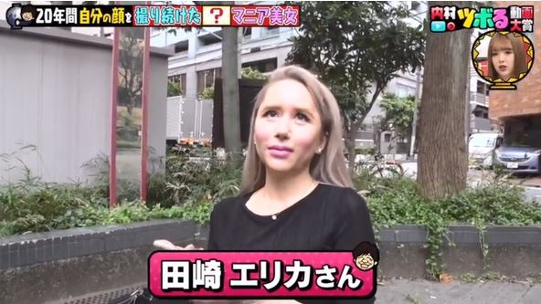 田崎(田崎エリカ)近日錄製日本綜藝節目《内村のツボる動画大賞》,今年已經40歲了,她相當喜愛外國女星的長相,包括安潔莉娜・裘莉(Angelina Jolie)、芭黎絲・希爾頓(Paris Hilton)等等,所以田崎也十分渴望自己能擁夠擁有像外國女星一樣深邃的五官。