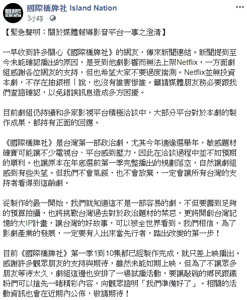 後來《國際橋牌社》也在臉書緊急發文澄清,內容寫道,「一早收到許多關心《國際橋牌社》的網友,傳來新聞連結。新聞提到至今未能確認播出的原因,是受到他劇影響而無法上架Netflix,一方面劇組感謝各位網友的支持,但也希望大家不要過度揣測。Netflix並無投資本劇,不存在抽銀根ㄧ說,也沒有誰害慘誰。籲請媒體朋友務必要跟我們查證確認,以免錯誤訊息造成多方困擾。目前劇組仍持續和多家影視平台積極洽談中,大部分平台對於本劇的製作成果,都持有正面的回應」。各位想追劇的朋友們就要再等等囉~