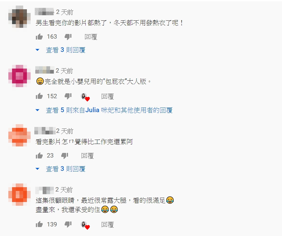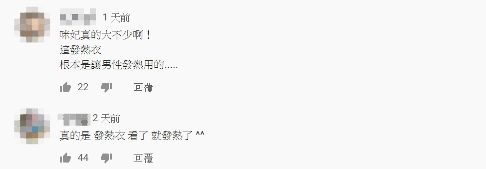 而影片中咪妃在試穿發熱衣時,由於衣服的緊身連體設計,讓她害羞直喊「單穿真的好像在穿『戰袍』」,大方露出好身材及修長美腿的她,也讓網友大歪樓紛紛暴動表示,「咪妃真的大不少啊!這發熱衣,根本是讓男性發熱用的.....」、「真的是,發熱衣,看了,就發熱了 ^^」、「看到好身材我已經熱熱的,不需要穿發熱衣」、「真的有夠正,那個屁股……那個腿………」、「這集很顧眼睛,最近很常露大腿,看的很滿足,盡量來,我還承受的住」。