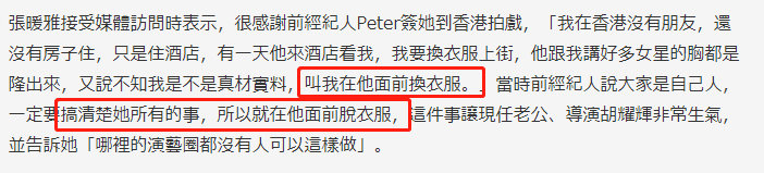 提到前經紀人Peter,過去張暖雅曾公開哭訴當時Peter曾要求她當場脫衣驗胸:「有一天他來酒店看我,我要換衣服上街,他跟我講好多女星的胸部都是隆出來的,又說不知道我是不是真材實料,叫我在他面前換衣服。」,張暖雅也將Peter當做自己人所以就在他面前脫衣,當時她出面控訴後也震撼演藝圈,造成一陣轟動。然而事隔6年後,張暖雅在上個月時也來台參加公益活動,也多次在台灣的燈會、音樂節上露面,一甩過去的陰霾持續在演藝圈中發展。