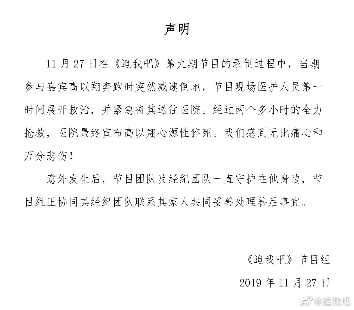 而後來《追我吧》節目組也發出聲明表示,「第九期節目錄製過程中,當期參與嘉賓高以翔奔跑時突然減速倒地,節目現場醫護人員第一時間展開救治,並緊急將其送醫!經過兩個多小時的搶救,醫院宣布『心源性猝死』,我們感到無比心痛和悲傷!」並且強調,意外發生後,節目團隊跟經紀團隊一直都在他身邊,節目組正協同其經紀團隊聯繫家人處理後事。