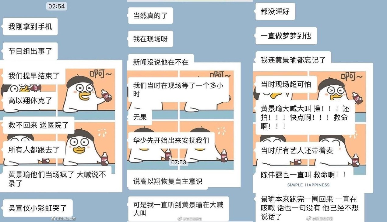 此外,當天有參加錄影的觀眾也說,「黃景瑜當場瘋了,大喊說不錄了!吳宣儀小彩紅則是哭了,我們當時在現場等了一個多小時,後來華少先出來安撫我們,說高以翔恢復自主意識!但是我一直聽到黃景瑜在大喊大叫,現場超可怕!黃景瑜大喊,『操!還拍!快點啊!救命啊!』當時所有藝人還帶著麥克風,陳偉霆也瘋喊『救命!』」