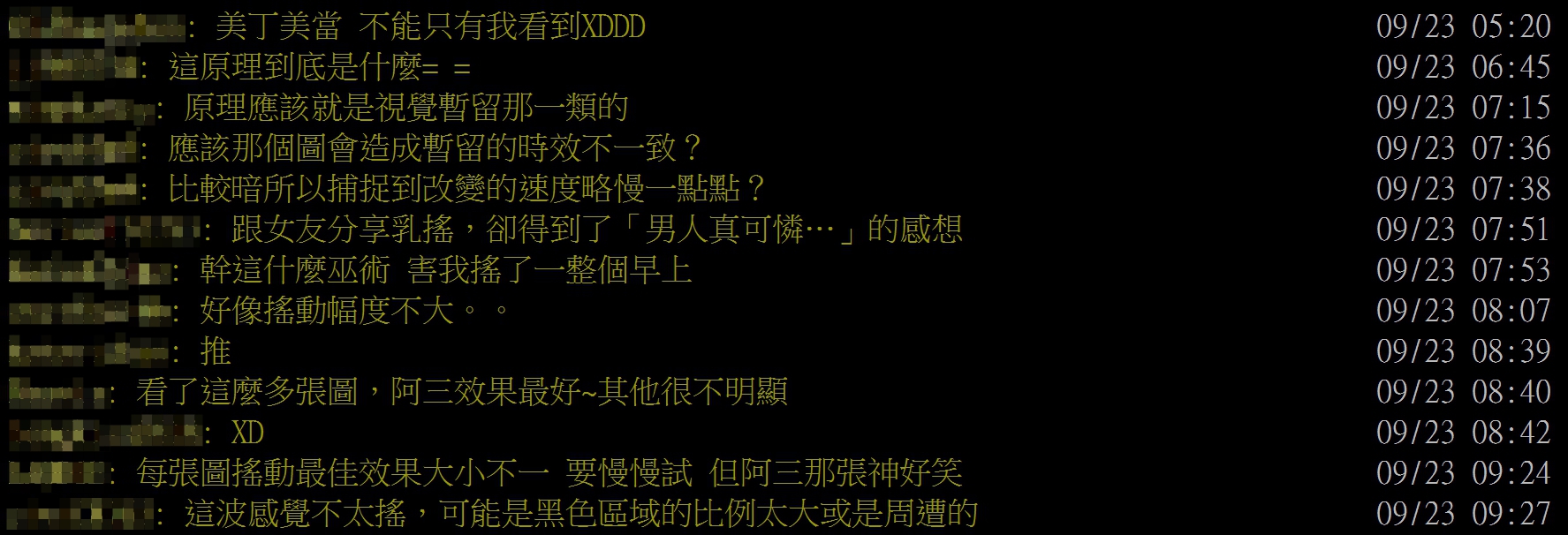 加上「乳搖效果」的圖片乍看之下很普通,但只要晃動手機,邊看邊搖晃,就能看到照片中被打上「馬賽克效果」的地方開始晃動,而這神奇的效果,其實是利用在圖片移動時,所產生「視覺暫留」的效果,才會讓圖片中的人物看起來就像有搖晃的效果。除了重要部位之外,也有網友會在角色的頭上,加上這種效果,這樣當大力晃動手機時,人物的頭也會跟著大力搖晃,十分有趣。
