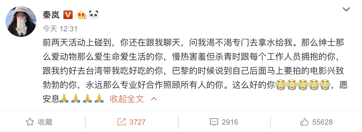 然而兩天前才和高以翔在活動中碰面的秦嵐也難過的發文寫下:「前兩天活動上碰到,你還在跟我聊天,問我渴不渴專門去拿水給我。那麼紳士那麼愛動物那麼愛生命愛生活的你,慢熱害羞但殺青時跟每個工作人員擁抱的你,跟我約好去台灣帶我吃好吃的你,巴黎的時候說到自己後面馬上要拍的電影興致勃勃的你,永遠那麼專業好合作照顧所有人的你。」,文末也悼念高以翔:「願安息」,一起合作電影《上海堡壘》的鹿晗也發出蠟燭以及祈禱的表情符號向故人傳遞心中的不捨。