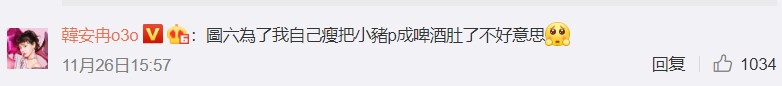 此文一出之後,網友也紛紛對於這組照片中老公凸出的肚子,笑翻表示「豬哥肚子是不是懷了(小狗圖案」,更有網友翻出另一張照片表示:「這腿P得也有點敷衍我了吧???」。隨後韓安冉也大方承認表示:「圖六為了我自己瘦,把小豬P成啤酒肚了,不好意思。」,並又發了則微博表示「P圖太麻煩了P不好了,我得我還是好好減肥吧,再瘦不下過年去抽脂。」