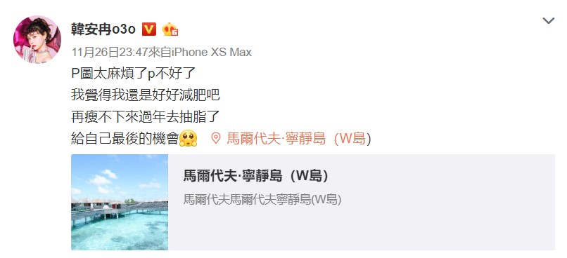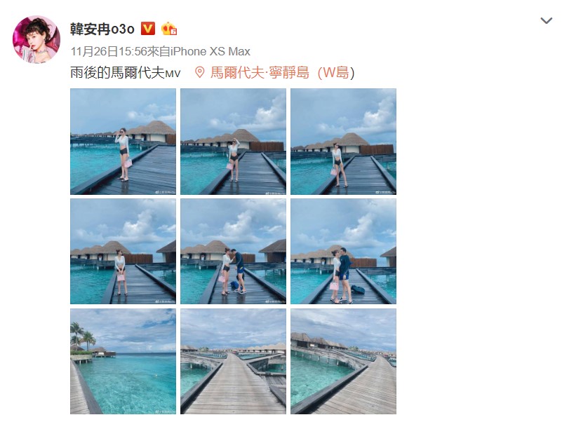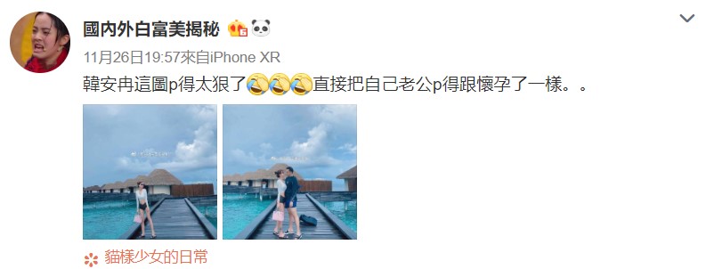 知名微博主韓安冉,年僅20歲就獲得了460萬人次的粉絲追蹤,在2015年因參加真人秀節目《變形計之青春作伴》而爆紅,16歲就開始整形至今四年整形次數高達33次,因為直言不做作的個性,獲得許多粉絲青睞。前日才在直播中哭訴自己婚姻失敗,近日,卻在微博中曬出與老公在馬爾地夫的合照,但眼尖網友發現韓安冉為了將遮掩自己的肚子,卻將老公的肚子P成啤酒肚,照片一曝光立刻引起討論。