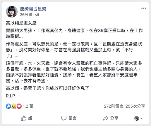 而國師唐綺陽在事情發生之後,也在臉書發文緬懷高以翔,她寫道,「高以翔是處女座,靦腆的大男孩,工作認真努力,身體健康,卻在35歲正盛年時,在工作時驟逝...作為處女座,可以想見的是,他一定很敬業!而且『長期處在透支身體狀態』,沒時間好好休息,才會在高強度挑戰又疊加上時,就『不行了』...」!