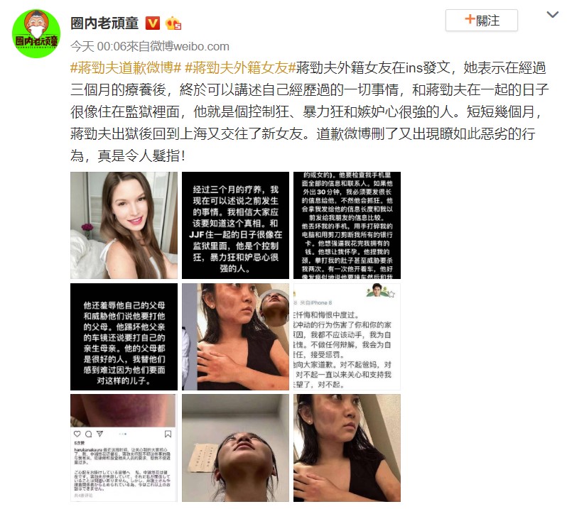 事實上,蔣勁夫去年就曾毆打日籍女友中浦悠花,遭到中浦悠花控訴動手打掉她牙齒,甚至還害她流產,全案鬧上日本警察署,最後以不起訴結案。事隔一年後,蔣勁夫又爆出暴力事件,讓網友氣憤表示:「完美的詮釋了,家暴只有0次和無數次。」