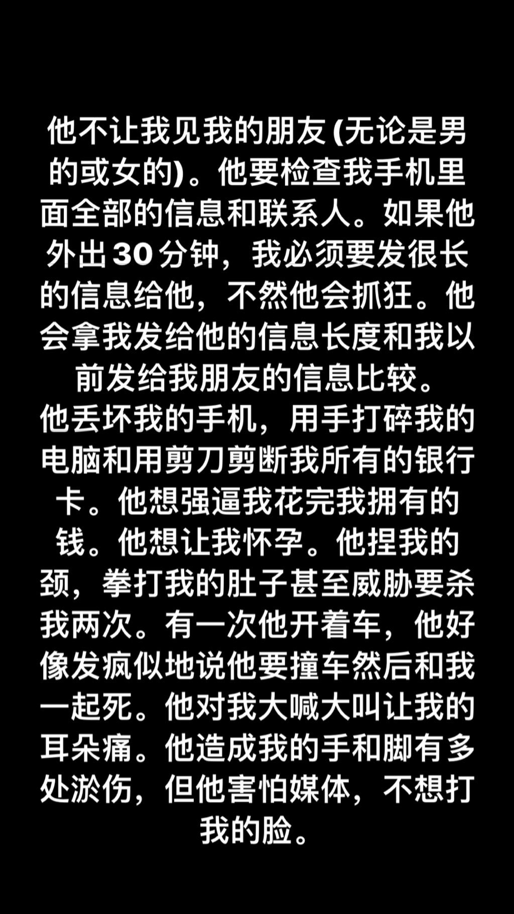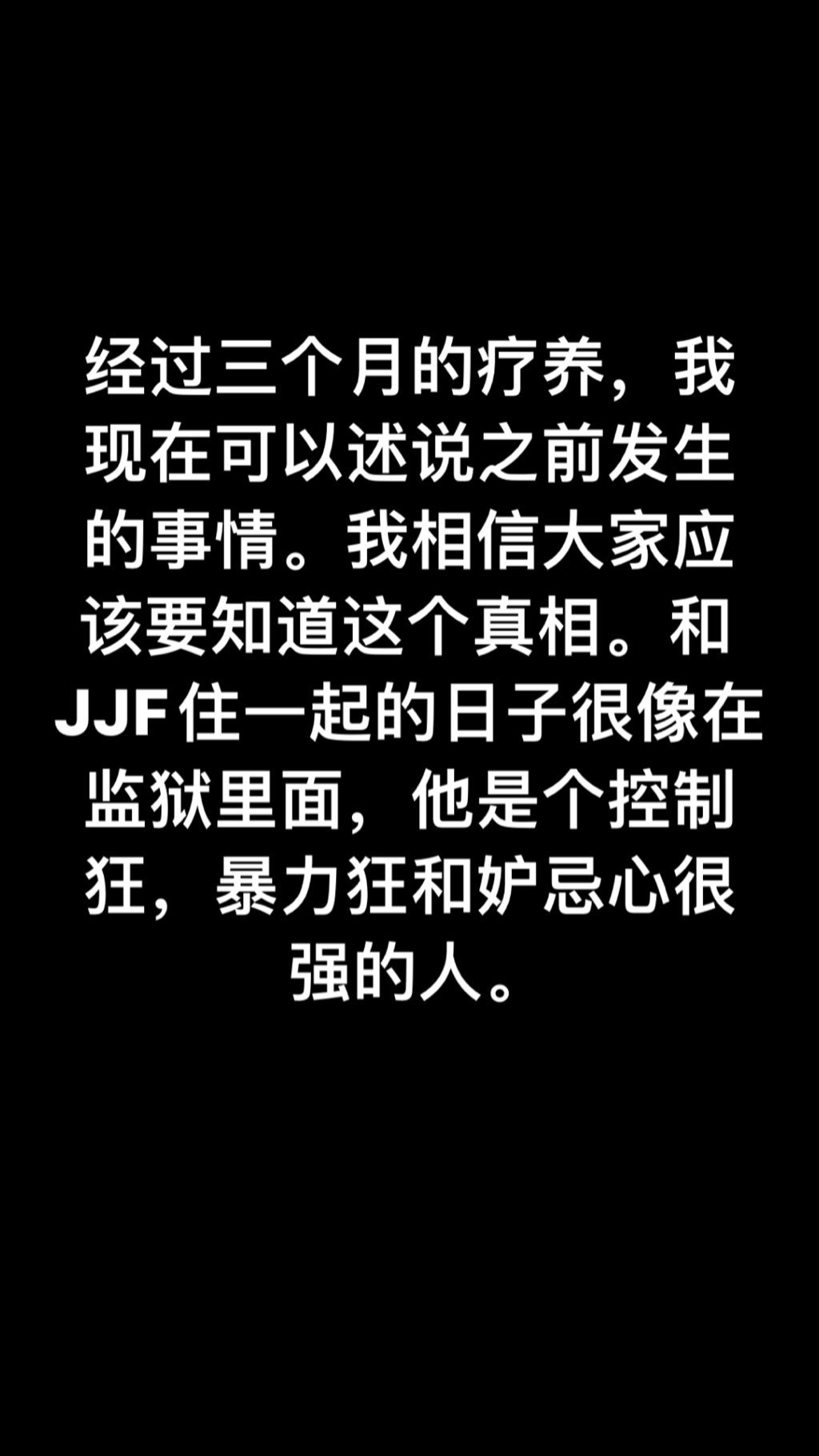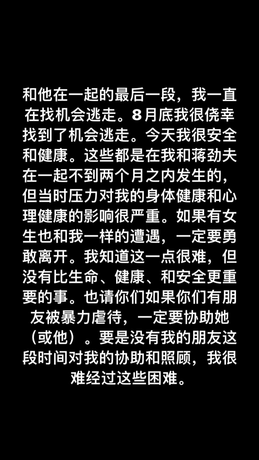 更進一步揭露蔣勁夫威脅她的生命安全,Julieta也在文中表示:「他羞辱自己的父母,威脅要打他們,他的父母都是很好的人,有這樣的兒子我替他們感到難過」。後來Julieta在八月的時候找到機會逃走,目前得她非常安全和健康,感嘆的表示以上發生種種恐怖行為,都是在與蔣勁夫在一起兩個月之內發生的。