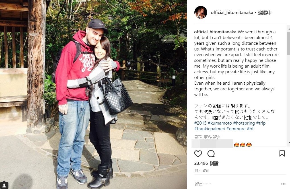 田中瞳除了有天使臉孔,以及O級上圍的魔鬼身材之外,還有著優秀的外文能力,去年五月中,她曾在IG上公開和金屬樂團EMMURE的主唱Frankie Palmeri的戀情,然而這段長達4年的戀情,最後在田中瞳在限時動態宣告兩人已經分手,田中瞳和男友的合照也已經全數刪除。