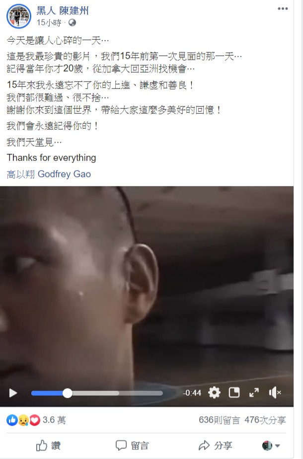 貼文中,黑人也寫道,「今天是讓人心碎的一天」,並說明這段影片是他在15年前第一次跟高以翔見面時拍下的,當初剛從加拿大回到亞洲發展的他才20歲,「我永遠忘不了你的上進、謙虛和善良!」對於高以翔的離去感到不捨及難過,「謝謝你來到這個世界,帶給大家這麼多美好的回憶!我們會永遠記得你的!我們天堂見...Thanks for everything.」