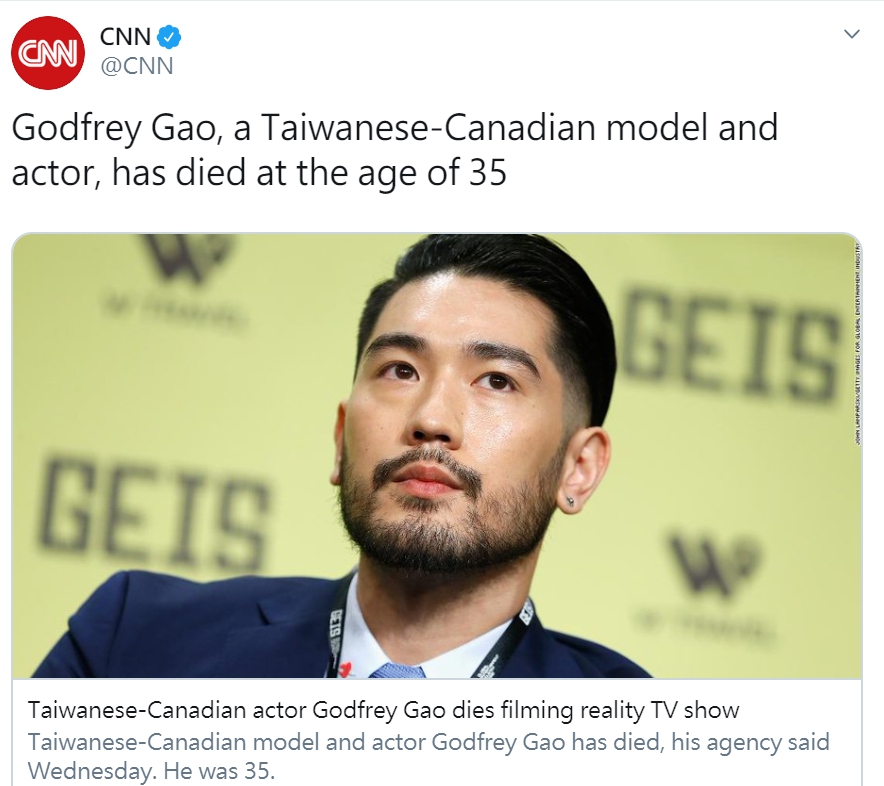 台裔加拿大籍男星高以翔27日在中國參加浙江衛視節目《追我吧》錄影,沒想到突然猝死,享年35歲!消息一傳開之後,連國際上許多名人都震驚不已,因為他是亞洲首位與LV簽約的男性模特兒,在國際上知名度相當高,許多國際媒體得知訊息後也在第一時間報導,包含了美國有線電視新聞網(CNN)、英國廣播公司(BBC)等,可感受到他的影響力非常大!