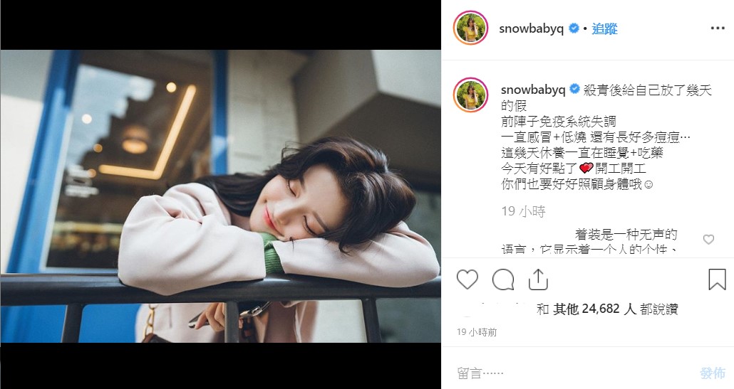 近日,蔡瑞雪在個人IG上表示,身體因為免疫系統失調的關係,不但一直感冒低燒,甚至因此長了許多痘痘!所幸趁著工作殺青,得到幾天放假可以好好地睡覺休養,加上按時吃藥,身體才漸漸好轉!然而身體才有點好轉的她,立刻開工重回工作崗位,讓粉絲也十分擔心。