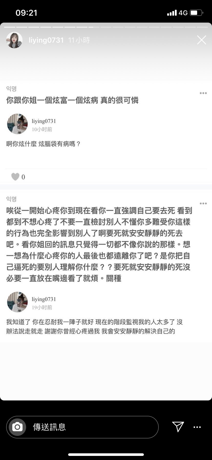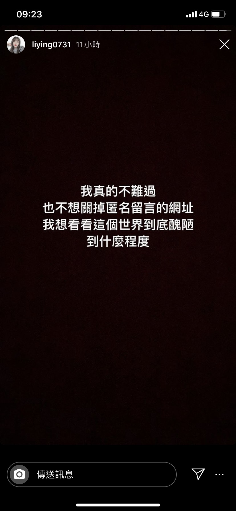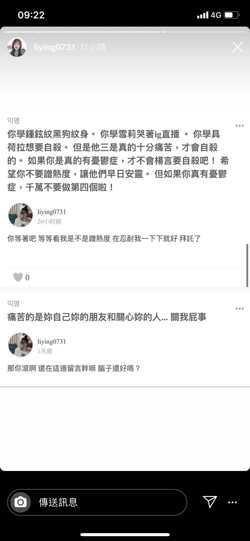 劉力穎反擊惡毒發言時,也不斷提到自己終有一天會完成大家心願,令人十分擔心。她更在限時動態最後說道,「我真的不難過,也不想關掉匿名留言的網址,我想看看這個世界到底醜陋到什麼程度」。事實上,劉力穎過去就曾提到,會想向粉絲坦承發病過程,是希望大家「不要同情,只要理解」,並非是為了要衝人氣。而當時她也提醒,面對身邊的憂鬱症患者時,安靜陪伴就是最好的方法。