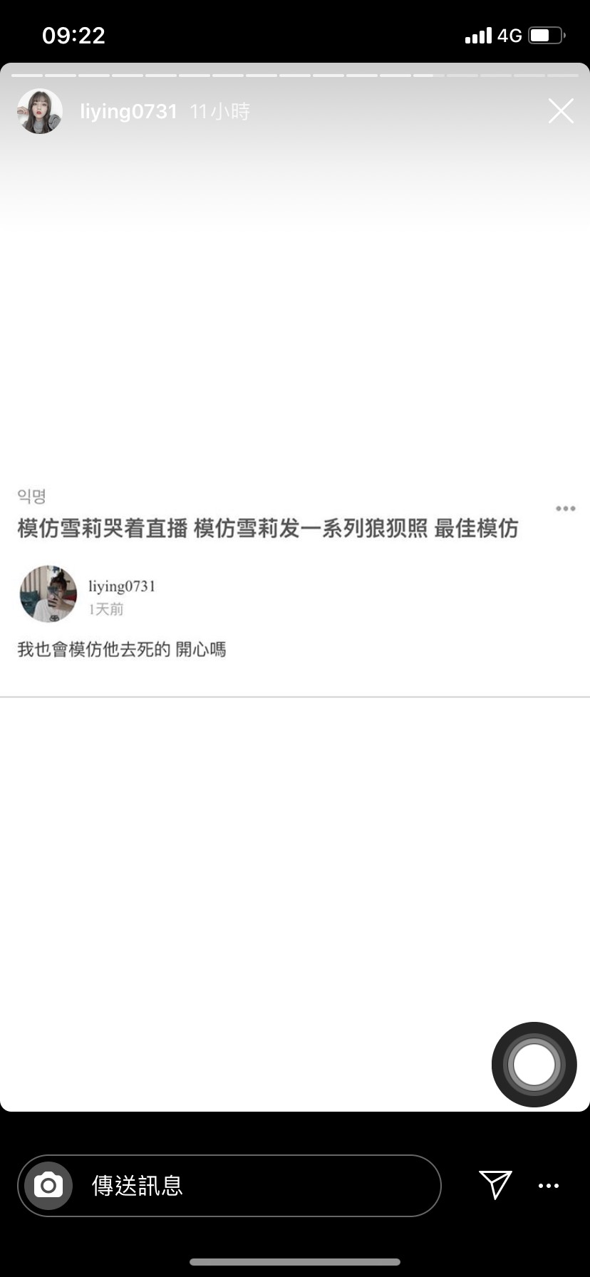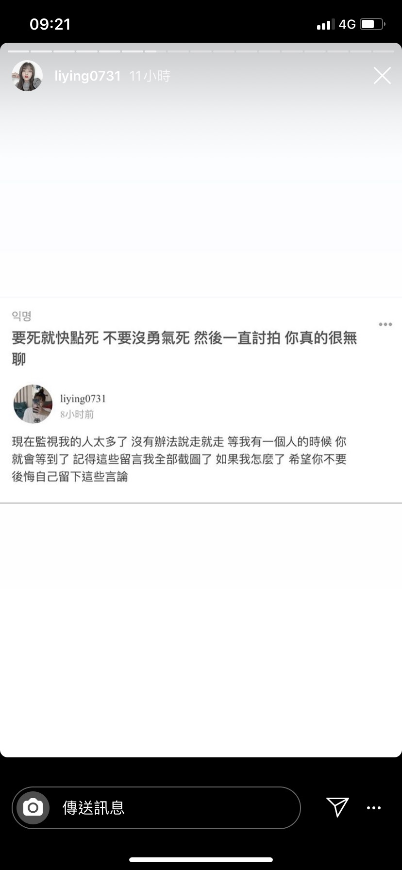 然而近日女星自殺事件頻傳,即便有人譴責「酸民行為」,但網路暴力似乎未因此而減少。深陷憂鬱症的劉力穎,近日仍遭受網路暴力,日前她在Instagram限時動態貼出收到的匿名留言,包括「要死就快點死,不要沒勇氣死,一直討拍,你真的很無聊」、「痛苦的是你自己、你的朋友、關心你的人,關我屁事」、「唉一開始心疼到現在看你一直強調自己要去死,這樣的行為完全影響到別人了,要死就安安靜靜地死去吧」,更有網友指控她學韓星「紋身、哭泣直播、想自殺」,其實根本是在蹭熱度等,毒舌話語令人髮指。