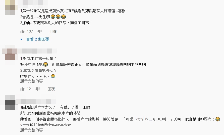 然而這次的Q&A影片結束之後,本本也出奇招,改由本本出問題並讓粉絲們回答,最後挑選一名網友送出禮包!也因此不少人在影片下方,紛紛留下對本本的第一印象,「好多前任渣男…但是超級無敵正又可愛蘿莉到爆」、「感覺就是超正超有偶包,結果原來是瘋子」、「這女孩可愛搞怪,有點中二還沒治好的感覺」、「真人版日系洋娃娃」、「長得很讓女生嫉妒」。