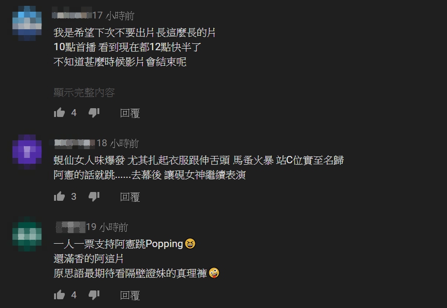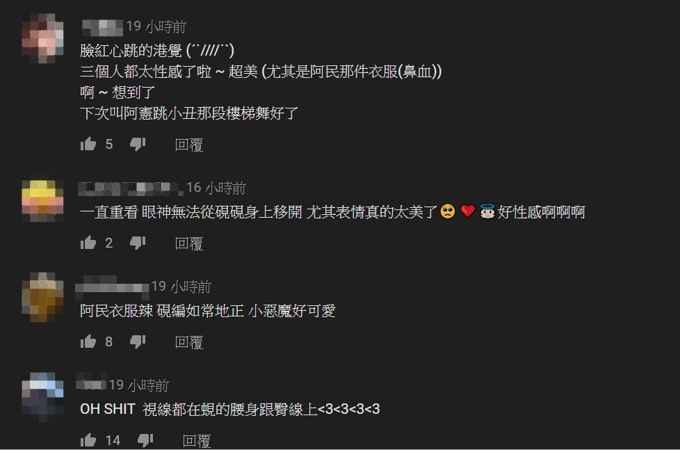 相較於阿民的「陽剛」,硯硯的舞姿受到阿憲大力稱讚「相當有女人味」,三人的好身材也讓網友流鼻血,紛紛留言「可不可以不要出這種要看很多遍的影片,我這幾天段考欸」、「蜆仙女人味爆發,尤其扎起衣服跟伸舌頭,站C位實至名歸」、「臉紅心跳的港覺 (ˊ˙////˙ˋ)三個人都太性感了啦~超美 (尤其是阿民那件衣服(鼻血))」、「一直重看,眼神無法從硯硯身上移開,尤其表情真的太美了,好性感啊啊啊」、「都在看小惡魔真的可愛,又可以性感,好正啊」。