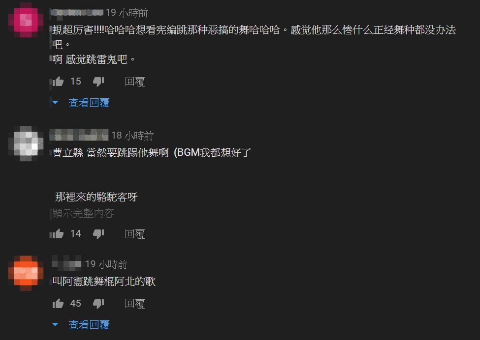 影片的最後,跳舞的三人也開玩笑要阿憲下次也下場跳舞,同時向觀眾徵求想看阿憲跳的舞種,網友也踴躍留言「阿憲跳breaking~我要看風車~湯瑪士迴旋~」、「叫阿憲跳舞棍阿北的歌」、「一人一票支持阿憲跳Popping」、「阿憲的話就跳......去幕後,讓硯女神繼續表演」。