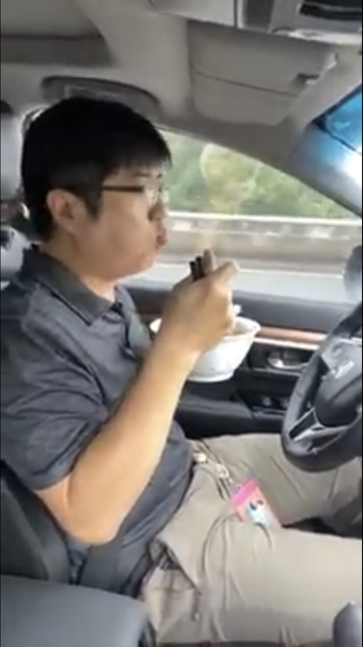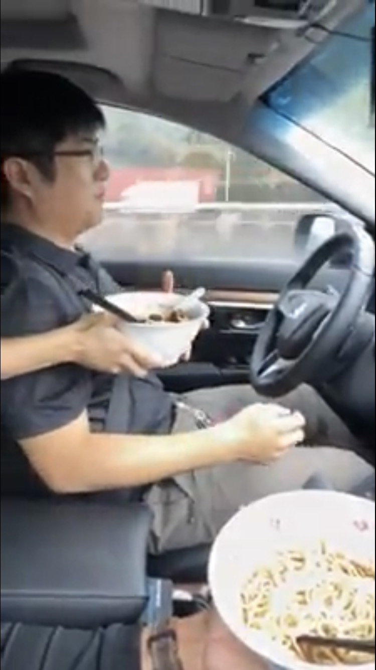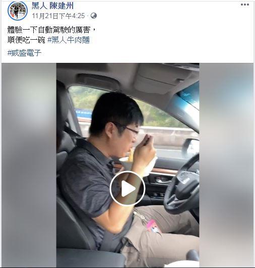 黑人陳建州在社群平台上發了一則影片,並寫道,「體驗一下自動駕駛的厲害,順便吃一碗黑人牛肉麵!」從影片中我們可以看到,黑人在車上拿著一碗牛肉麵,跟大家介紹他們正在邊坐車邊吃麵,後來鏡頭拍到擋風玻璃前有一台手機,「這個正在偵測中,厲害吧!」接著口中說出,「自動駕駛!」就讓車子開始自己動,而駕駛則是直接拿了一碗牛肉麵之後開吃,雙手完全離開了方向盤!