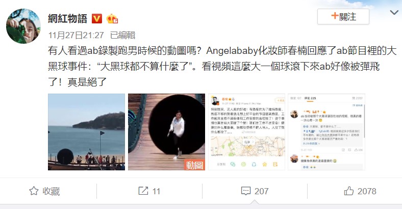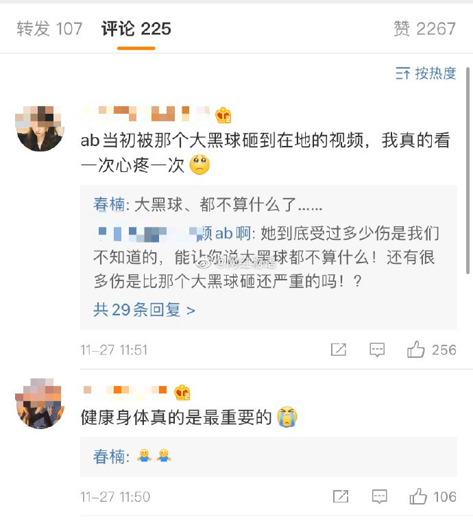 此文一出,在留言區有網友回憶起Anglebaby在《奔跑吧》節目中被巨大的黑球追趕下,為了完成節目的遊戲任務,賣力奔跑下不慎跌倒,導致了摔成一個「撲街」,而這次的意外也造成Anglebaby無名指「永久性損傷」。有網友在回覆中表示:「ab當初被那個大黑球砸到在地的視頻,我真的看一次心疼一次」,春楠也在下方回覆該名網友「大黑球,都不算什麼......」,隱約透露出Anglebaby在節目中受過非常多的傷。