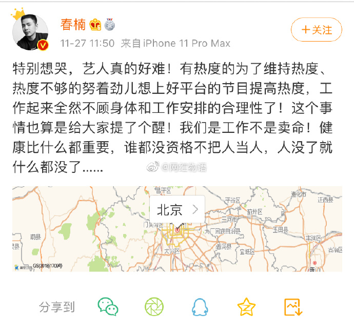 近日高以翔在節目中猝死的噩耗震驚了整個演藝圈,27號時知名美妝微博主春楠揭露了許多藝人背後的辛酸,更提到許多藝人為了做足節目效果,文中表示:「工作起來全然不顧身體和工作安排的合理性了!」,在發生了高以翔因為在節目中奔跑中猝死後,「這個事情也算是給大家提了個醒!我們是工作不是賣命!健康比什麼都重要,誰都沒資格不把人當人」,同時也在文中最後感嘆的表示:「人沒了就甚麼都沒了」。