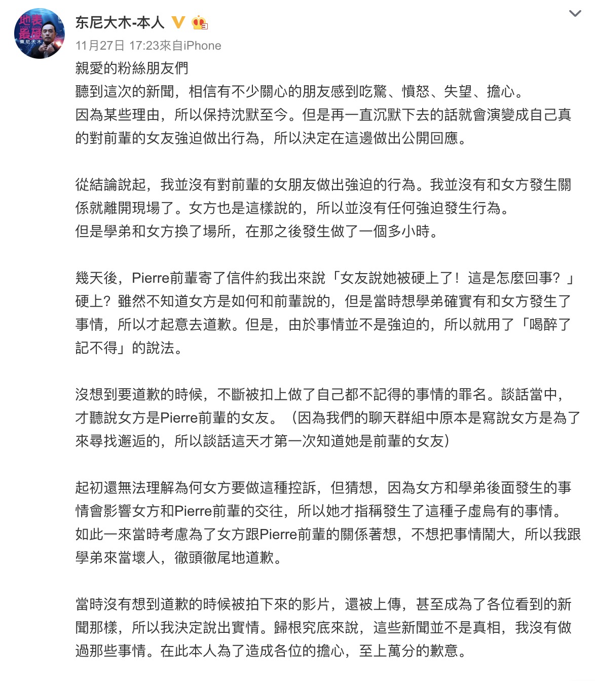 然而就在影片曝光後,東尼大木也神隱多日才在27號時於社群平台上發表聲明,並寫下:「從結論說起,我並沒有對前輩的女朋友做出強迫的行為。我並沒有和女方發生關係就離開現場了」,但就在學弟(橫山一光)和女方換到另一個場所後,兩人發生了一個多小時的關係,撇清自己並沒有對女方下手。接著提到為何會向前輩道歉是因為學弟真的有和女方發生關係,但因為並非強迫性質所以才會在道歉時用了「喝醉了記不得」的說法,更在文末表示:「歸根究底來說,這些新聞並不是真相,我沒有做過那些事情」,否認了關於性侵的傳聞。