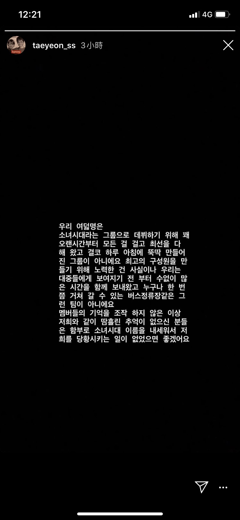 29日時,太妍在個人IG的限時動態上,用黑底白字長文表示,為了以少女時代的成員出道,成員們從很久以前,就賭上全部並竭盡全力,更透露:「絕不是在一天之內馬上就做起來的組合。在我們面向大眾之前,就一起經歷無數時間,絕不是那種像公車站一樣,誰都能經歷過一次的組合。」更直批:「不要再捏造成員們的記憶,沒有和我們一起揮灑過汗水的人們,希望不要再隨意打出少女時代的名號,製造出讓我們惶恐的事情。」