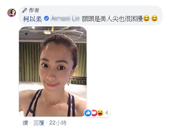 但也有眼尖的網友發現,柯以柔的頭頂似乎很明顯少了一塊頭髮,網友擔心的說,「髮際掉髮嚴重!缺了一大塊」,柯以柔也解釋說,「額頭是美人尖也很困擾啊~」並附上一張半身自拍照,讓大家看看照片中她髮型乾淨束起的模樣,有帶點清新妝容,讓大家仔細看見她的額頭上的美人尖,是真的很明顯,所以才會讓人誤以為她是有禿頭啦!