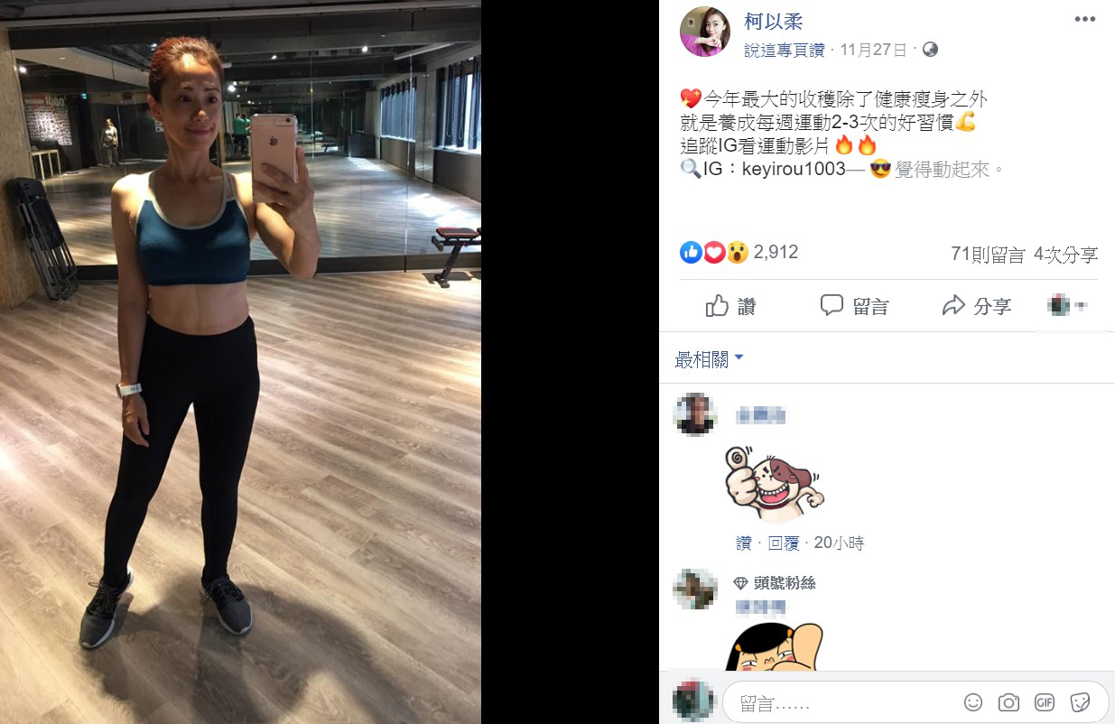 而柯以柔也在貼文中寫道,「今年最大的收穫除了健康與瘦身之外,就是養成每週運動2至3次的好習慣」沒想到,她的健身照一發出之後,馬上引起網友熱烈關注與討論,大部分的網友都紛紛大讚,「超棒的!很健康正能量~」、「看到微微的線條了耶!」、「精神、氣色整個變超讚」。