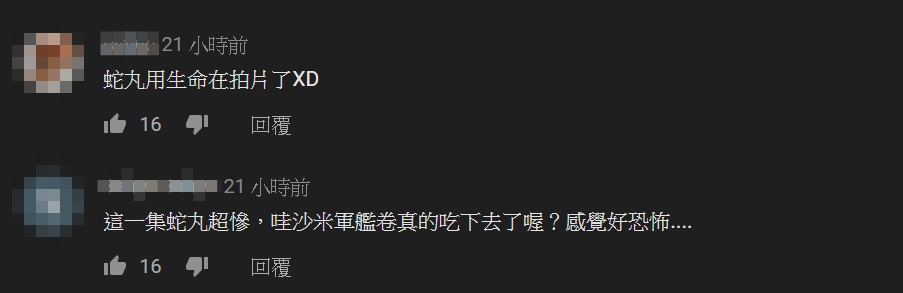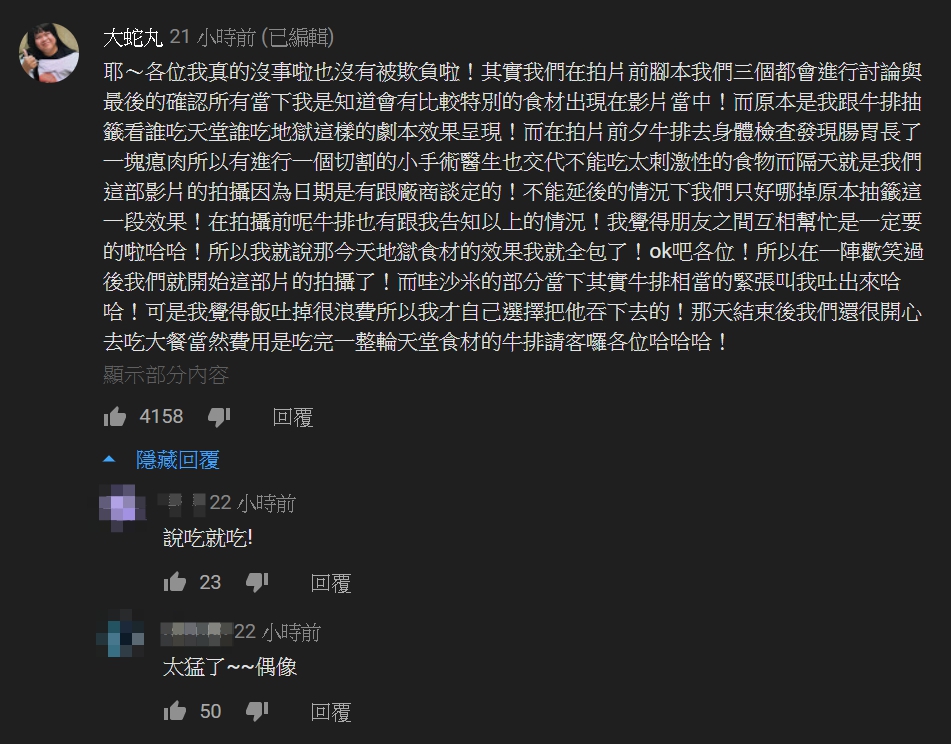 而蛇丸本人也在YouTube影片底下留言「耶~各位我真的沒事啦也沒有被欺負啦!」,他表示「其實我們在拍片前腳本都會進行討論與最後的確認,所以當下我是知道會有比較特別的食材出現在影片當中!」,由於他知道牛排的胃情況不好,因此決定全包當天的地獄食材,至於為什麼直接吞下,是因為「飯吐掉很浪費」才選擇吞下去,最後蛇丸也提到拍攝影片結束後,大家還開開心心地吃了牛排請客的大餐!從蛇丸的留言中可以看出團隊感情非常好,而蛇丸的義氣也讓網友誇讚「太猛了~~偶像」、「說吃就吃!」。
